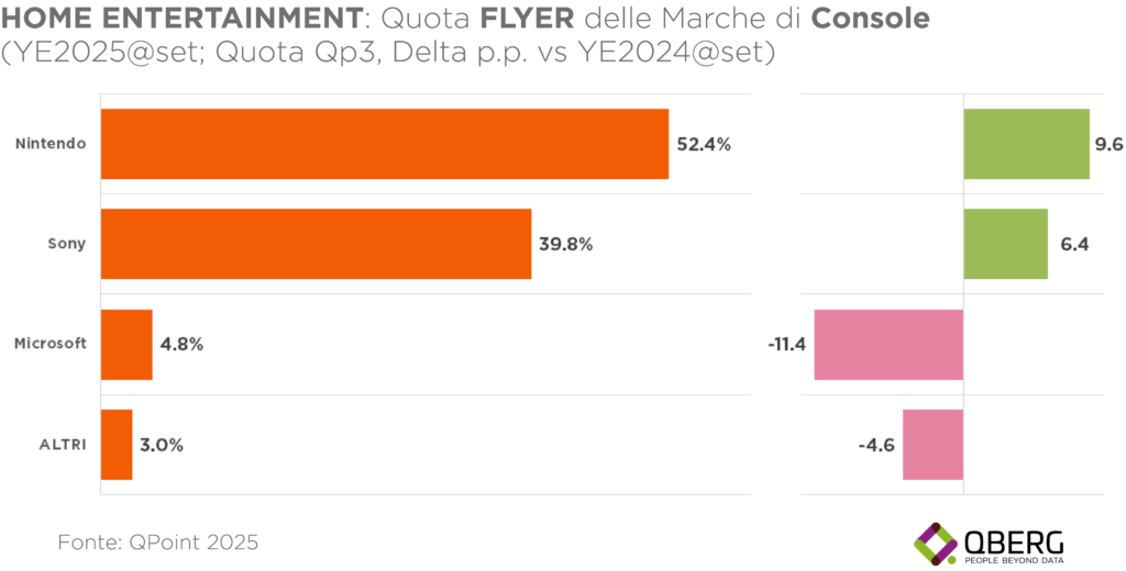 Nel corso degli ultimi dodici mesi da settembre 2024 a settembre 2025 (YE 2025), Nintendo è stata la Consolle più promozionata sui Flyer italiani, con una quota di visibilità del 52,4%, seguita da Sony (con il 39,8%) e molto da lontano da Microsoft (4,8%). Il confronto con l’anno terminante a settembre precedente sembra indicare con chiarezza una quasi fuoriuscita da questo canale promozionale di Microsoft che perde in dodici mesi -11,4% punti di quota di visibilità. Lo spazio di visibilità liberatosi è stato subito occupato dagli altri grandi brand del settore come Nintendo +9,6% e Sony +6,4% mentre gli Altri Brand faticano a trovare visibilità sul canale promozionale Flyer (-4,6%, quota YE 2025 al 3,0%).