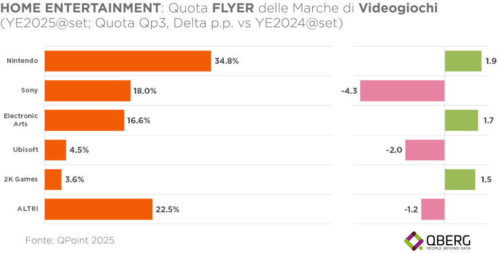 I tre grandi brand (Sony, Microsoft e Nintendo) che dominano il segmento delle Consolle (nell’insieme il 97%) nel segmento del software per Videogiochi hanno una visibilità promozionale sui Flyer decisamente inferiore (insieme al 53,7%). Nintendo e Sony sono leader di mercato (rispettivamente 34,8% e 18,0% di quota di visibilità). Microsoft ha una quota realmente simbolica (0,9%, -0,7 vs gli ultimi dodici mesi), anche se avendo acquistato due anni fa uno dei leader mondiale di videogiochi ‘Activision Blizzard’ (Call of Duty, World of Warcraft), presumibilmente nel medio-lungo termine, tenderà a promuovere maggiormente il suo software per Videogiochi anche sui volantini. Rispetto allo YE 2024, lo YE 2025 vede in crescita la visibilità promozionale dei Videogiochi Nintendo (+1,9%), Electronic Arts (+1,7%) e degli Altri brand (al 25,2%, +3,4%), mentre in contrazione si trovano Sony (-4,3%) e Ubisoft (-2,0%).