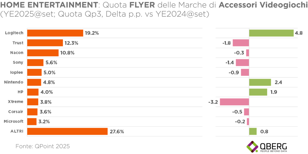 Se nelle Consolle e nel software per Videogiochi i tre principali brand (Sony, Microsoft, Nintendo) hanno quote di visibilità molto importanti, ben diverso è il discorso per gli Accessori delle Consolle. Infatti nello YE 2025 i tre principali brand possiedono una quota di visibilità di solo 13,6%. Gli spazi sui Flyer italiani nel segmento Accessori sono soprattutto di aziende specializzate in mouse e controller quali Logitech, il leader con il 19,2% di visibilità, Trust (12,3%) e Nacon (10,8%). Tanti gli Altri brand medi e piccoli (più di 50) che cercano di conquistare spazi promozionali sui Flyer, tuttavia, nello YE 2025 rispetto allo YE 2024, nonostante le tante proposte e la leadership del settore (27,6%) aumentano di poco la loro visibilità (+0,8%). Rispetto a dodici mesi fa crescono anche alcuni storici brand quali Logitech (+4,8%), Nintendo (+2,4%) e HP (+1,9%), mentre tutti gli altri brand presenti nella Top10, diminuiscono la loro quota.