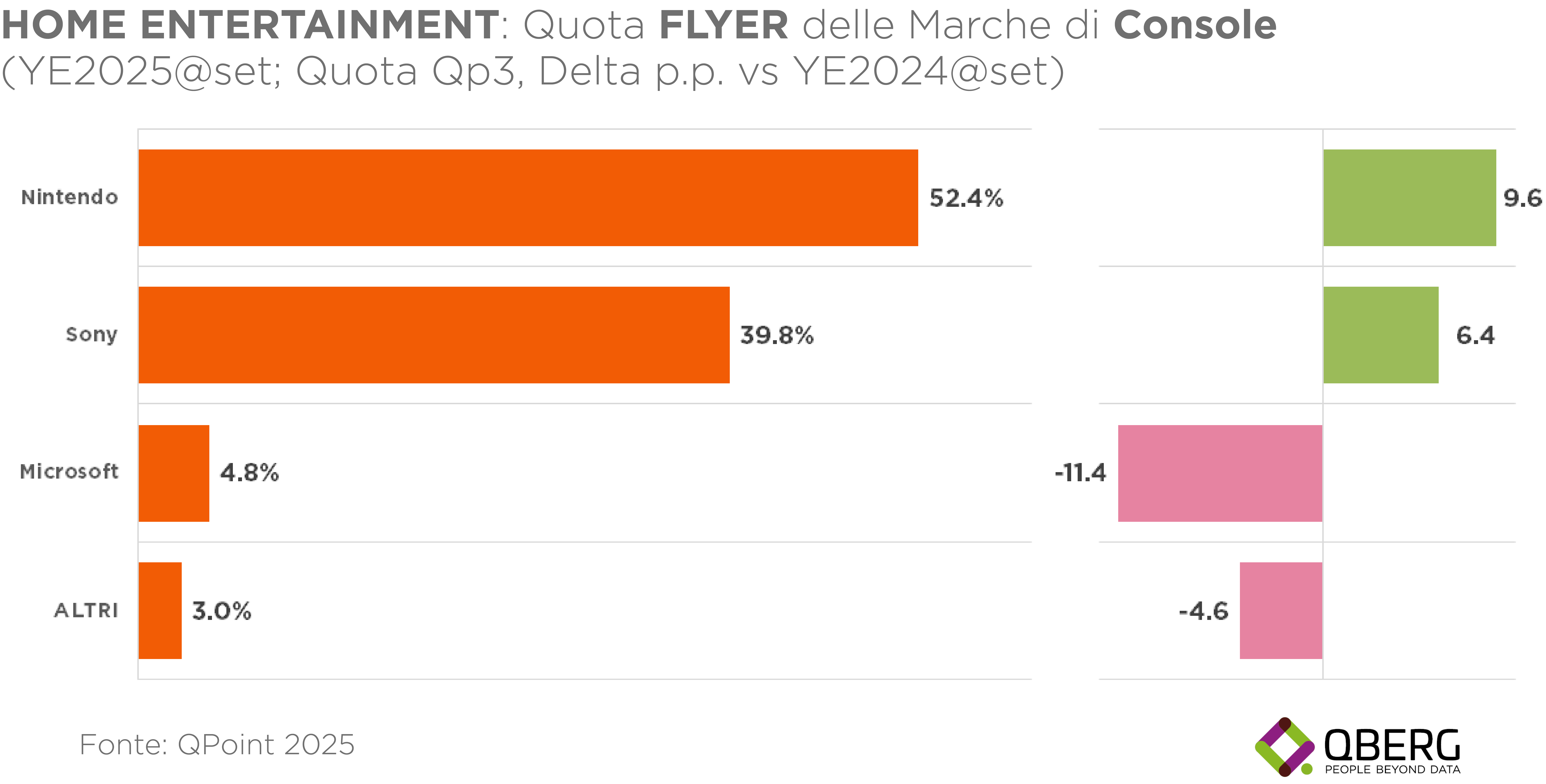 Nel corso degli ultimi dodici mesi da settembre 2024 a settembre 2025 (YE 2025), Nintendo è stata la Consolle più promozionata sui Flyer italiani, con una quota di visibilità del 52,4%, seguita da Sony (con il 39,8%) e molto da lontano da Microsoft (4,8%). Il confronto con l’anno terminante a settembre precedente sembra indicare con chiarezza una quasi fuoriuscita da questo canale promozionale di Microsoft che perde in dodici mesi -11,4% punti di quota di visibilità. Lo spazio di visibilità liberatosi è stato subito occupato dagli altri grandi brand del settore come Nintendo +9,6% e Sony +6,4% mentre gli Altri Brand faticano a trovare visibilità sul canale promozionale Flyer (-4,6%, quota YE 2025 al 3,0%).