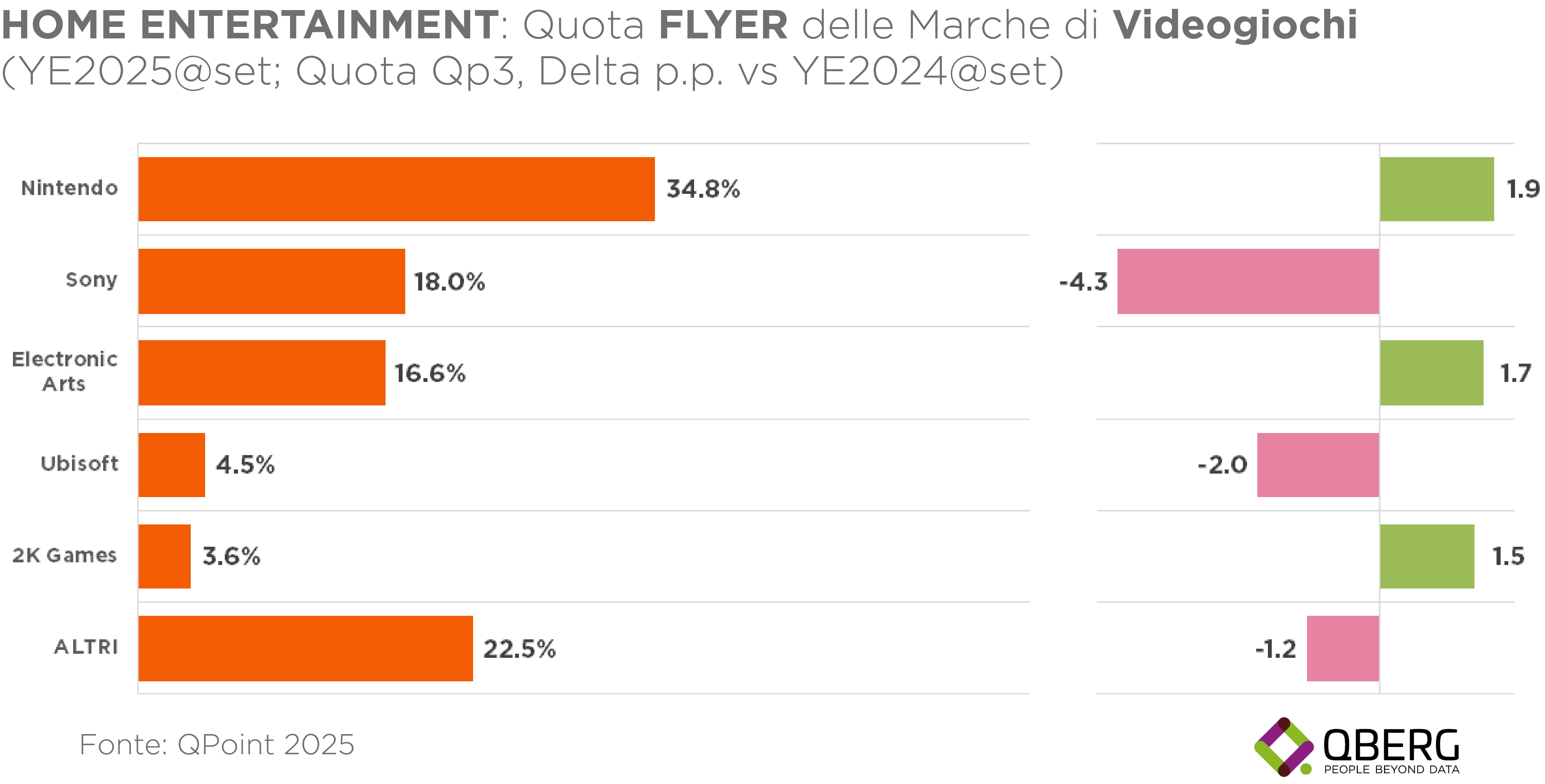 I tre grandi brand (Sony, Microsoft e Nintendo) che dominano il segmento delle Consolle (nell’insieme il 97%) nel segmento del software per Videogiochi hanno una visibilità promozionale sui Flyer decisamente inferiore (insieme al 53,7%). Nintendo e Sony sono leader di mercato (rispettivamente 34,8% e 18,0% di quota di visibilità). Microsoft ha una quota realmente simbolica (0,9%, -0,7 vs gli ultimi dodici mesi), anche se avendo acquistato due anni fa uno dei leader mondiale di videogiochi ‘Activision Blizzard’ (Call of Duty, World of Warcraft), presumibilmente nel medio-lungo termine, tenderà a promuovere maggiormente il suo software per Videogiochi anche sui volantini. Rispetto allo YE 2024, lo YE 2025 vede in crescita la visibilità promozionale dei Videogiochi Nintendo (+1,9%), Electronic Arts (+1,7%) e degli Altri brand (al 25,2%, +3,4%), mentre in contrazione si trovano Sony (-4,3%) e Ubisoft (-2,0%).