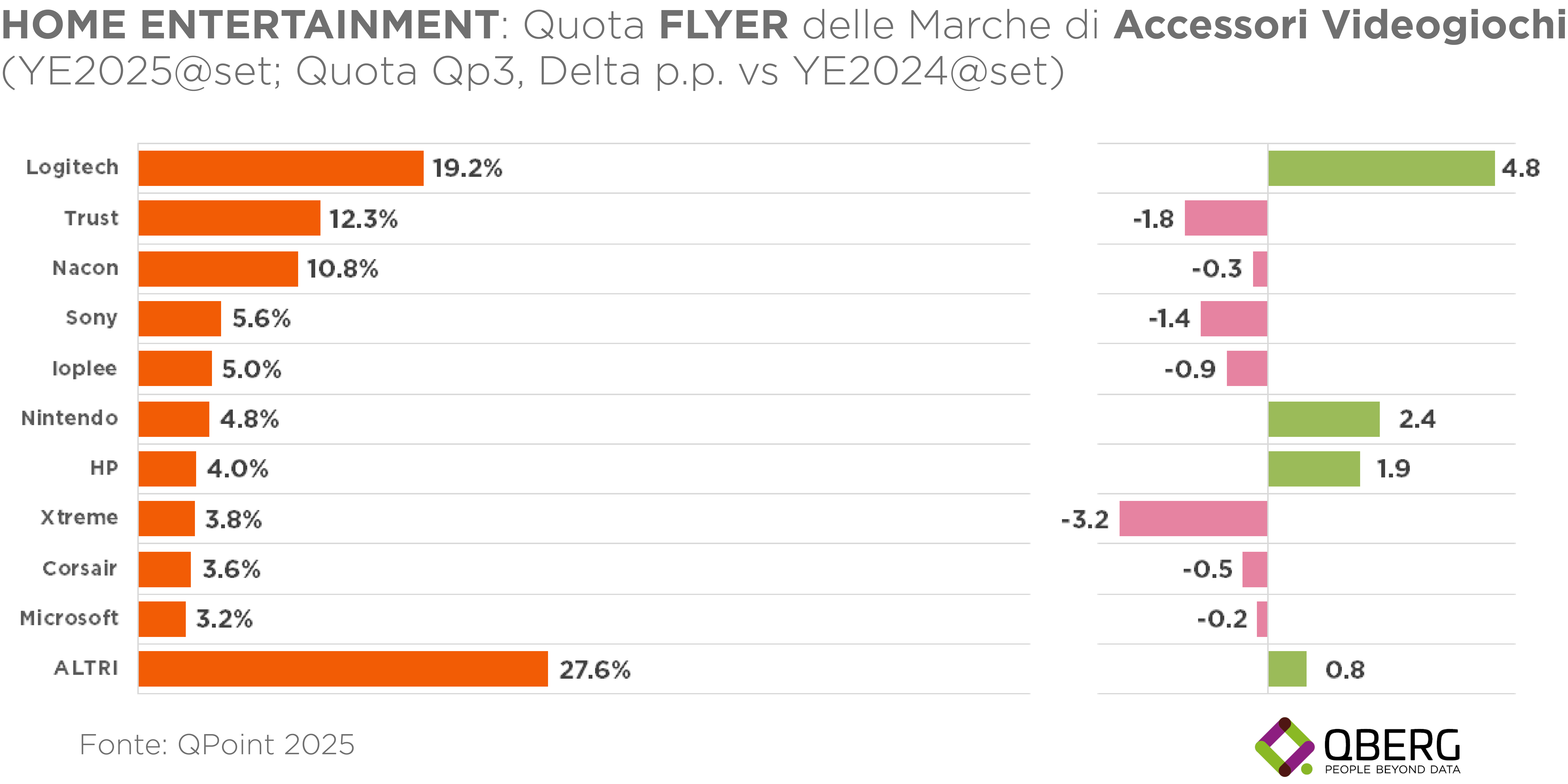 Se nelle Consolle e nel software per Videogiochi i tre principali brand (Sony, Microsoft, Nintendo) hanno quote di visibilità molto importanti, ben diverso è il discorso per gli Accessori delle Consolle. Infatti nello YE 2025 i tre principali brand possiedono una quota di visibilità di solo 13,6%. Gli spazi sui Flyer italiani nel segmento Accessori sono soprattutto di aziende specializzate in mouse e controller quali Logitech, il leader con il 19,2% di visibilità, Trust (12,3%) e Nacon (10,8%). Tanti gli Altri brand medi e piccoli (più di 50) che cercano di conquistare spazi promozionali sui Flyer, tuttavia, nello YE 2025 rispetto allo YE 2024, nonostante le tante proposte e la leadership del settore (27,6%) aumentano di poco la loro visibilità (+0,8%). Rispetto a dodici mesi fa crescono anche alcuni storici brand quali Logitech (+4,8%), Nintendo (+2,4%) e HP (+1,9%), mentre tutti gli altri brand presenti nella Top10, diminuiscono la loro quota.