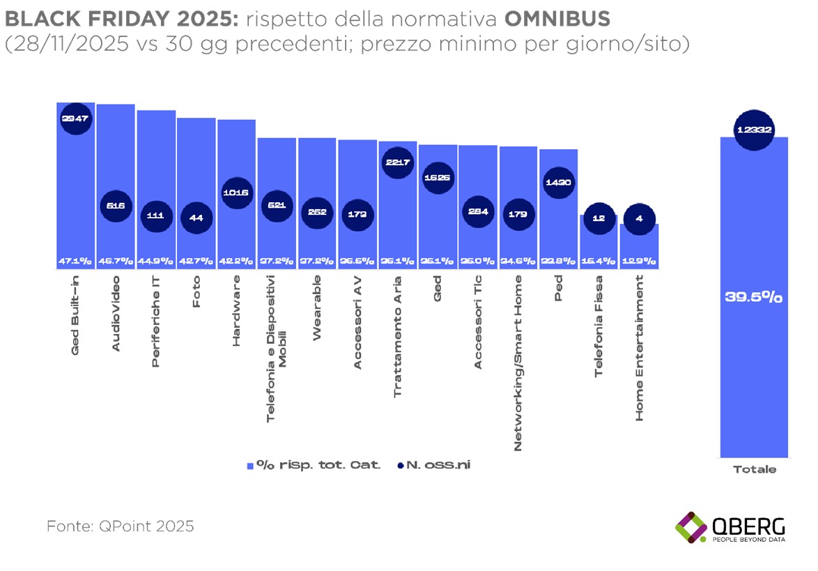 L’ultima analisi proposta da QBerg ha avuto come oggetto la verifica che tutte quelle osservazioni chiaramente identificate come “Sconto” (quindi non “Prezzo consigliato”, “Prezzo listino”, “Prezzo manufacturer” o altre locuzioni del genere) rispettassero la Omnibus, esponendo quindi un prezzo che era effettivamente il più basso rispetto ai 30 giorni precedenti, sempre a parità di modello e di sito. Anche qui la situazione non è rosea: pur parlando di un universo più ridotto (31.245 osservazioni “In promozione”), ben il 39.5% di queste non rispettavano la Omnibus. Le Categorie più colpite sono di nuovo il Ged Built-in, con il 47.1% delle offerte “fuori norma”, seguita da Audio Video (46.7%) e Periferiche IT (44.9%).