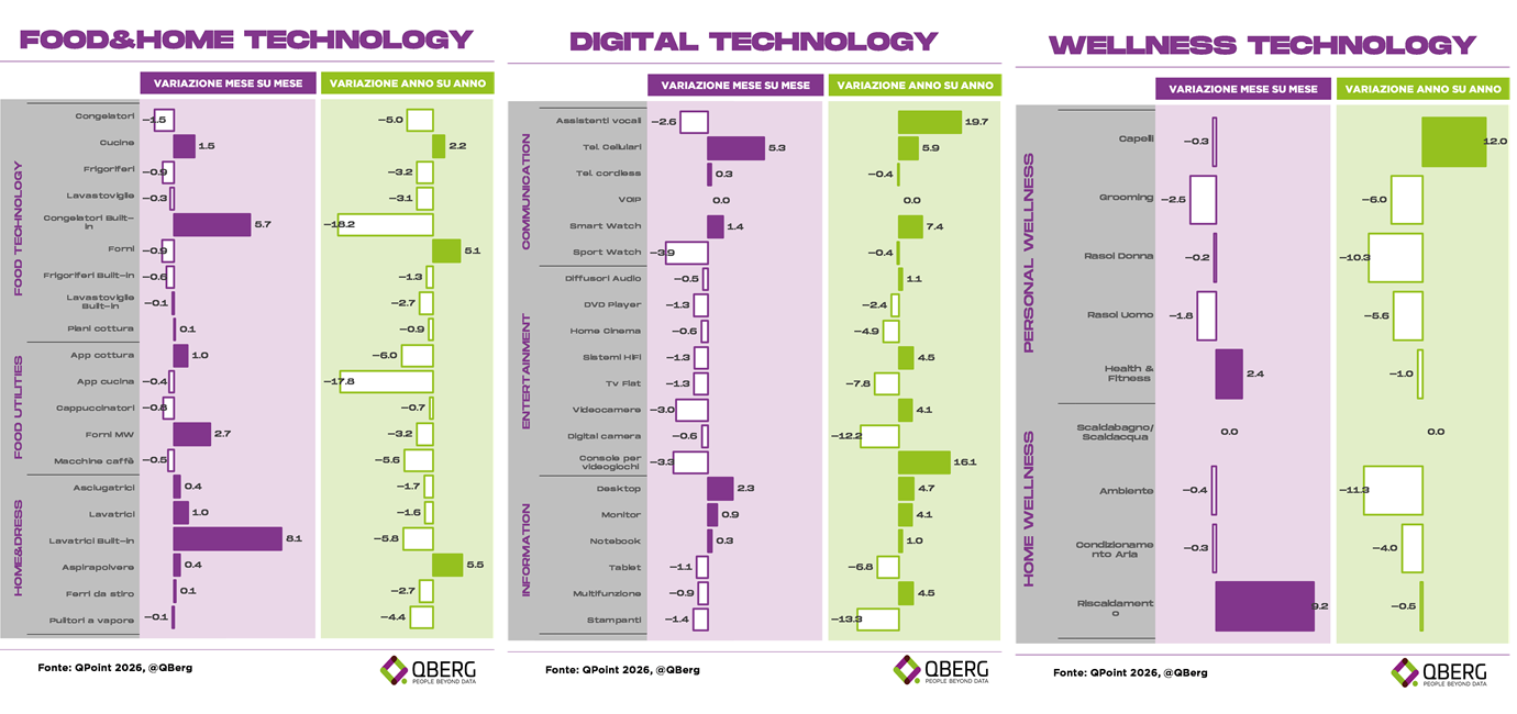 La Wellness Technology evidenzia un andamento eterogeneo: solo i prodotti per il riscaldamento e gli smartwatch dedicati al fitness registrano aumenti, mentre la maggior parte dei segmenti è in lieve calo rispetto a febbraio. Nel confronto annuo, l’unico segmento in crescita è quello dei prodotti per capelli, mentre gli altri risultano in contrazione, in alcuni casi anche significativa.